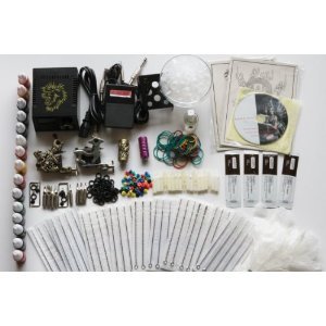 This is a Brand New Top Quality Customized Tattoo Kit, all items in package are selected base on suggestions of experienced artists. All basics you need to start your tattooing hobby are included. Tattoo needles are E.O. Gas sterilized. We using the 45 copper threads strand silicone insulated tattoo gun power cord which offer very good conductivity and flexibility. Here are the items in kit and their major specifications: * A Super Popular 10 Layer Warp Coils Tattoo Machine Gun. * A Super Popular 10 Layer Wrap Coils Craved Antique Tattoo Gun With Snake Leather Pattern Wrap * A Craved Antique Grip Matching Style With Gun * A Purple Grip with Rod * UL listed Digital Power Supply Set operating at 110V/220V Output 2Vdc to 20Vdc * Foot Control Power Switch * A Very Unique High Quality Silicone Insulated Tattoo Power Cord * 4 Alloy Round Tips and 4 Alloy Magnum Tips(3R 5R 5M 7M on each) * 18 Disposable Tips * 2 Set of Tools * 50 Cushion Ring and Rubber Band * 50 Artists Selected Disposable Needles(3rl 5rl,rs,m1 7rl,rs,m1 9rl,rs,m1) * 1 Set of 10 Colors 1/3oz 10ml Base Inks,(Red. Brilliant Blue. White. Black. Green.Golden.Dark Brown.Light Pink.Sky Blue.Royal Violet.) * 100 Ink cups and a Cup Holder * Printing Transfer Oil, 4 packs of ointment, 2 pairs of Rubber Glove * 2 Practicing Leather Like Sheet with Tiger and Dragon Pattern * A Tutoring CD, A 8"X11"X3" Water Proof Polyester Carry Bag